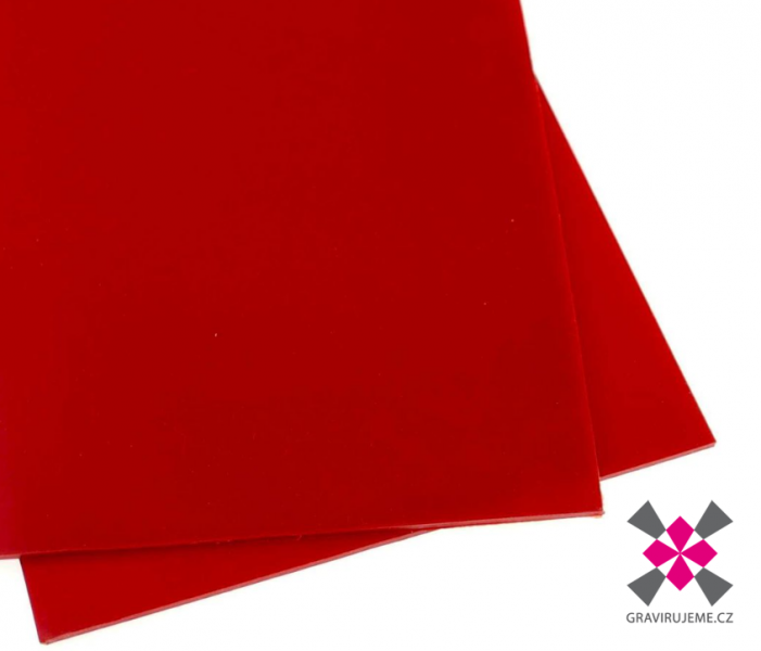Specifikace: • Tloušťka 3 mm • Barva červená • Tvrdost 80 ShA +/- 5% • Hladký povrch z obou stran • Doporučená hloubka gravírování: 75%