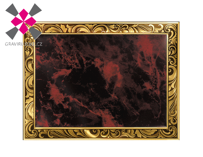 Hliníková dekorativní cedule v provedení tmavě červený mramor, zlatá, s raženým zlatým okrajem.