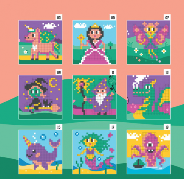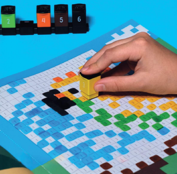 Kombinace pixel artu a razítkování podle čísel dělá z hračky intuitivní, kreativní a zábavnou činnost, která rozvíjí jemnou motoriku a současně i fantazii dětí.